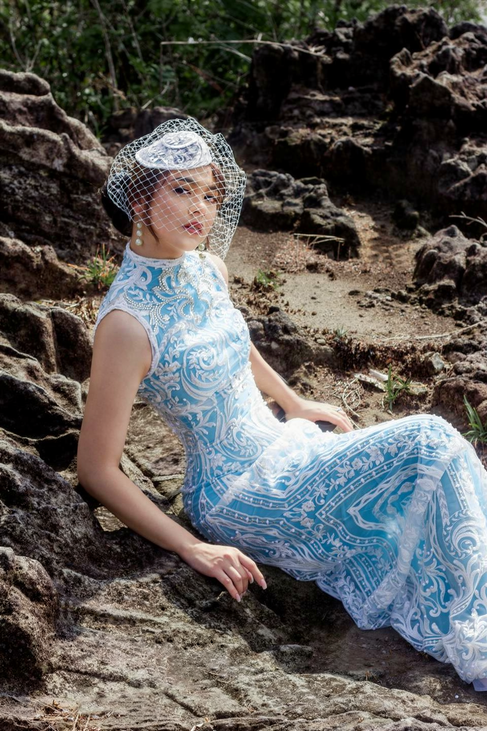 Change the color of the woman's lace wedding dress to sky blue (light blue, #87CEEB), while keeping all lace embroidery details white and fully visible. Preserve the original fabric texture, transparency, patterns, highlights, and natural folds.