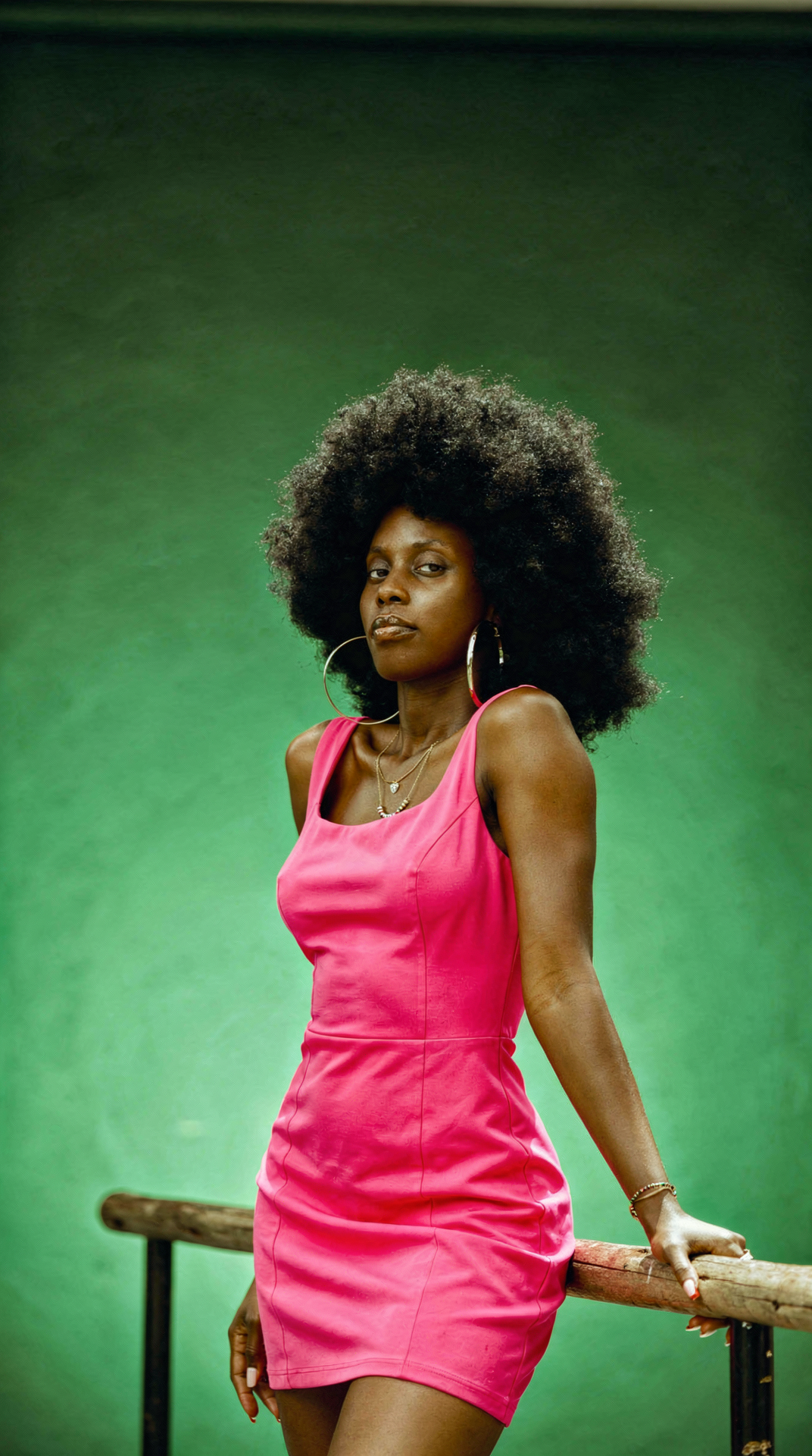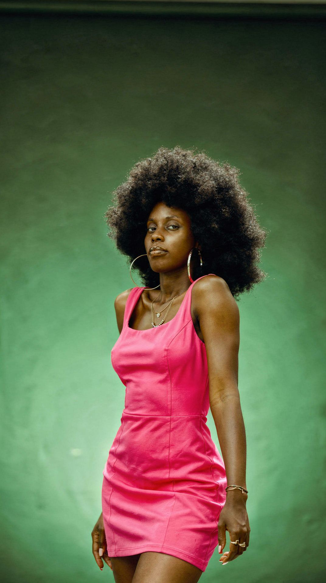 Change the woman's outfit to a bold fuchsia pink dress against a green studio gradient background.