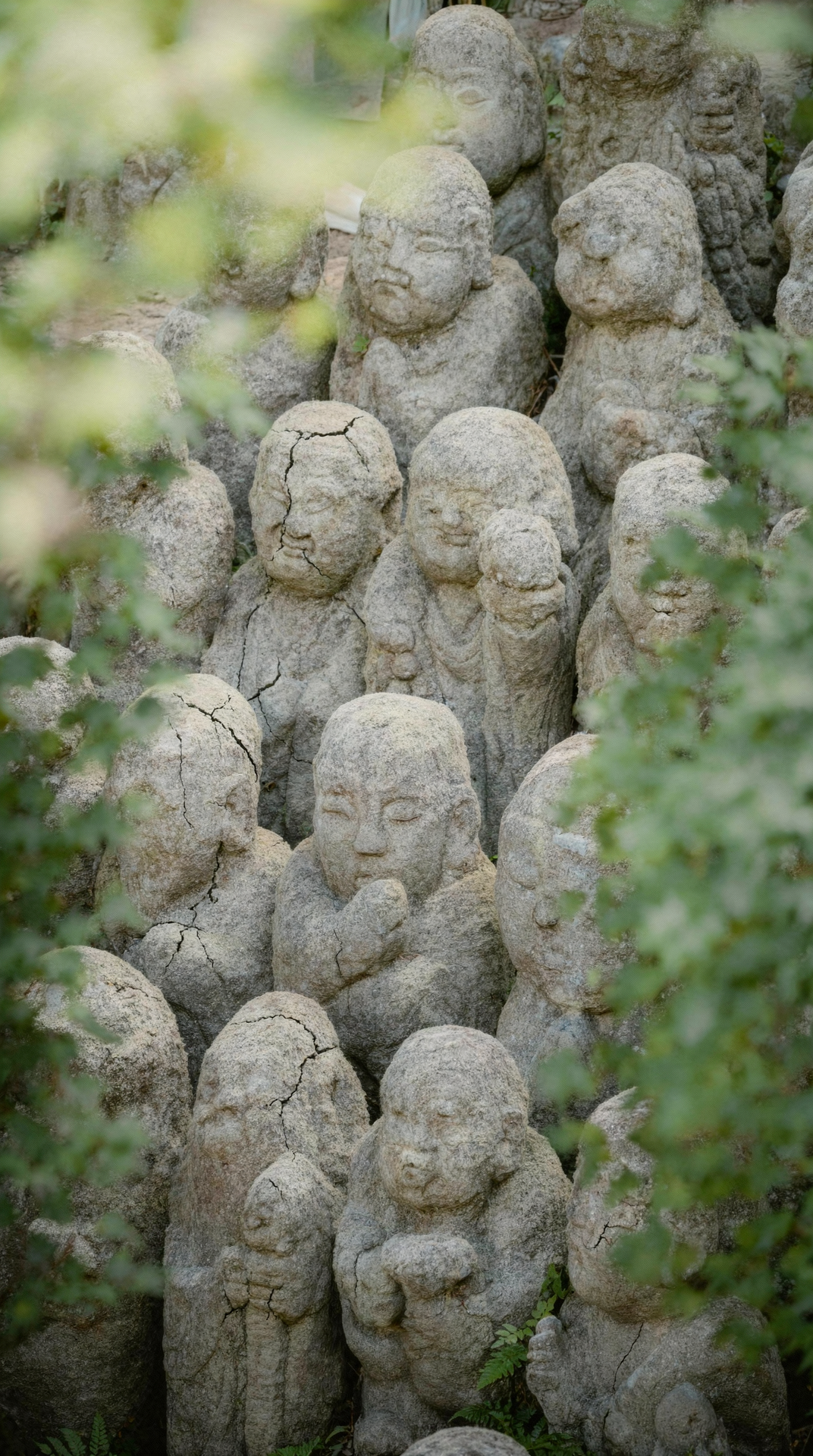 Remove all vegetation moss and greenery from the statues. Keep only the original stone structure with no plants no moss no algae no green tint. Reveal the raw stone texture with visible small cracks and natural erosion.
