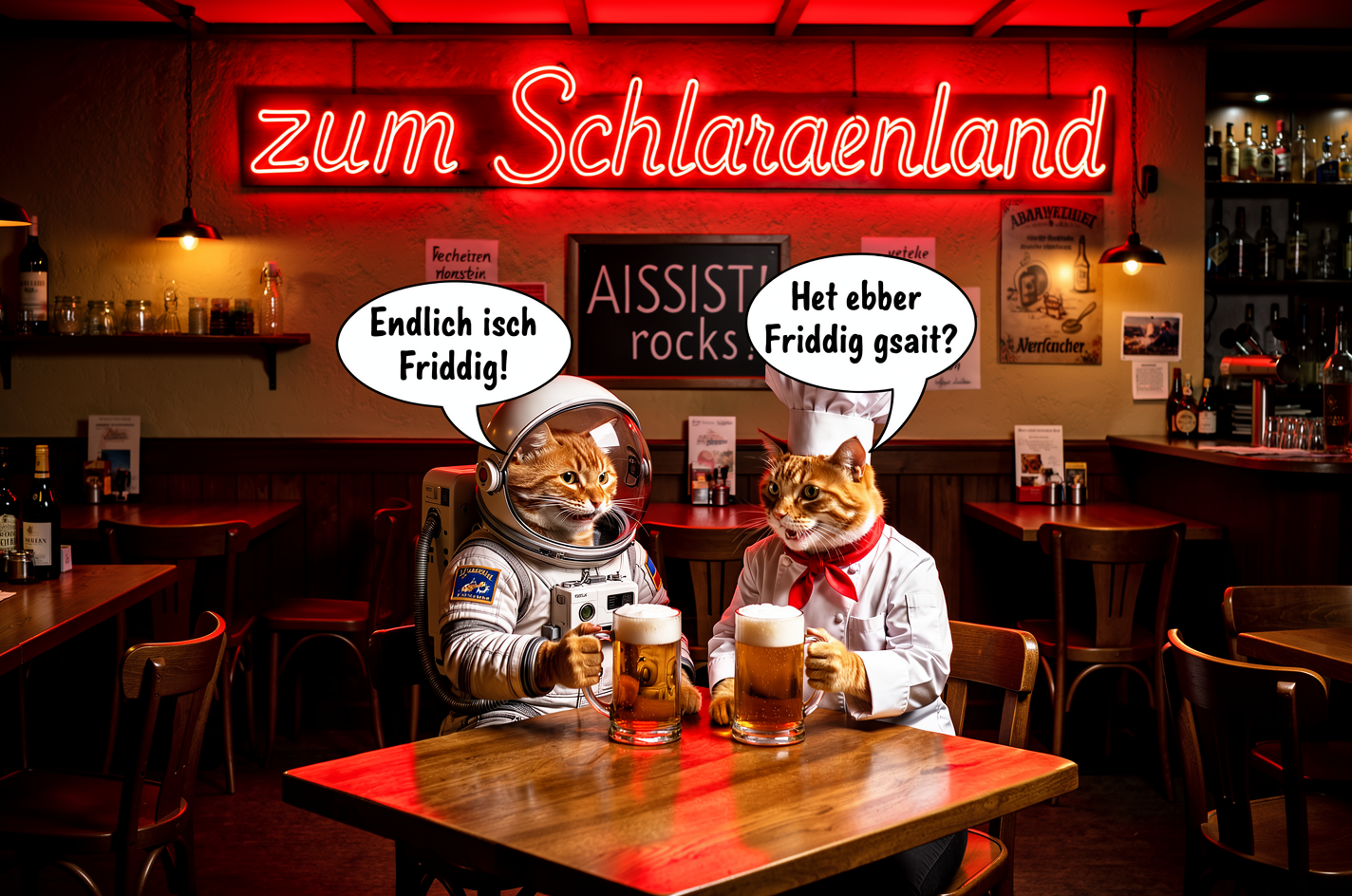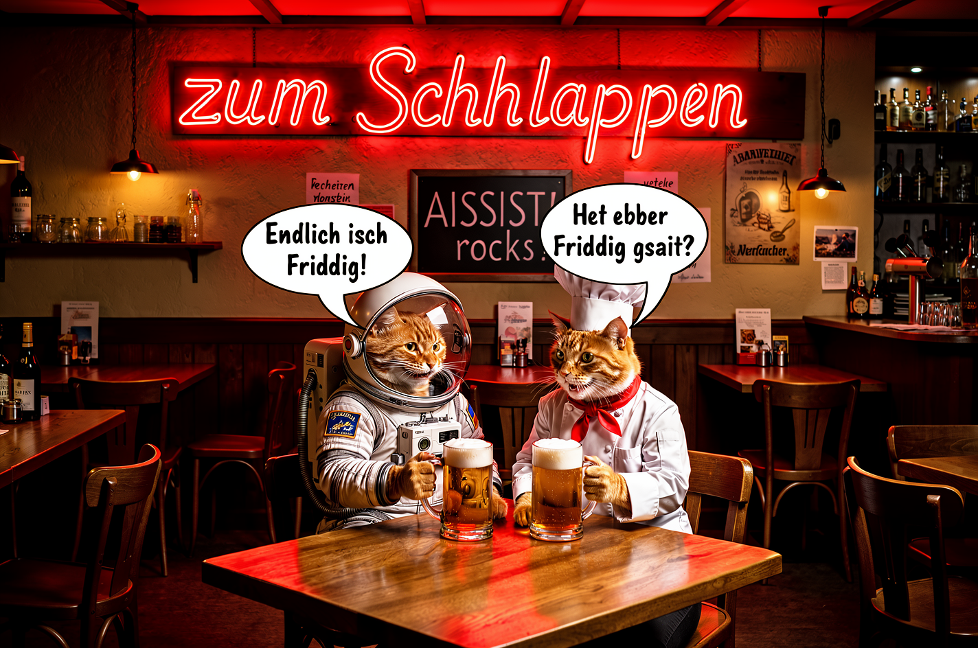 Change the text on the neon sign to 'zum Schlappen'