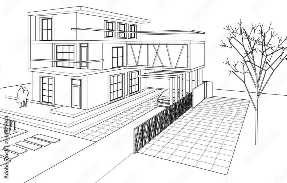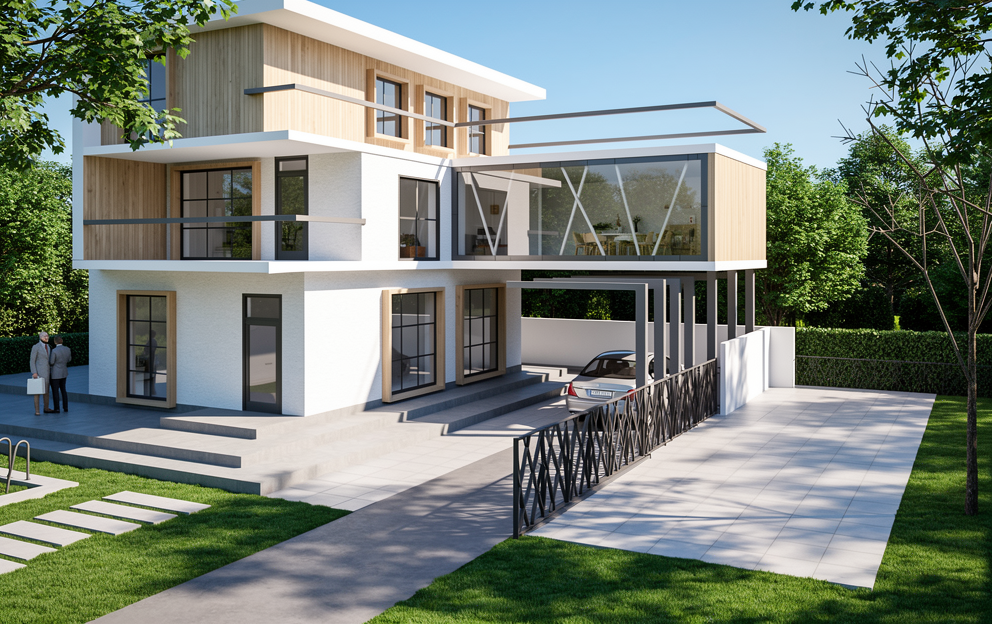 Transform the architectural illustration from image 1 into a fully realistic house, natural lighting, real textures for walls windows and roof, realistic landscaping around the house, accurate shadows, real materials such as wood stone and glass, high resolution photorealism, clean perspective, keep the proportions and layout exactly as in the illustration while turning every element into a believable real world version.