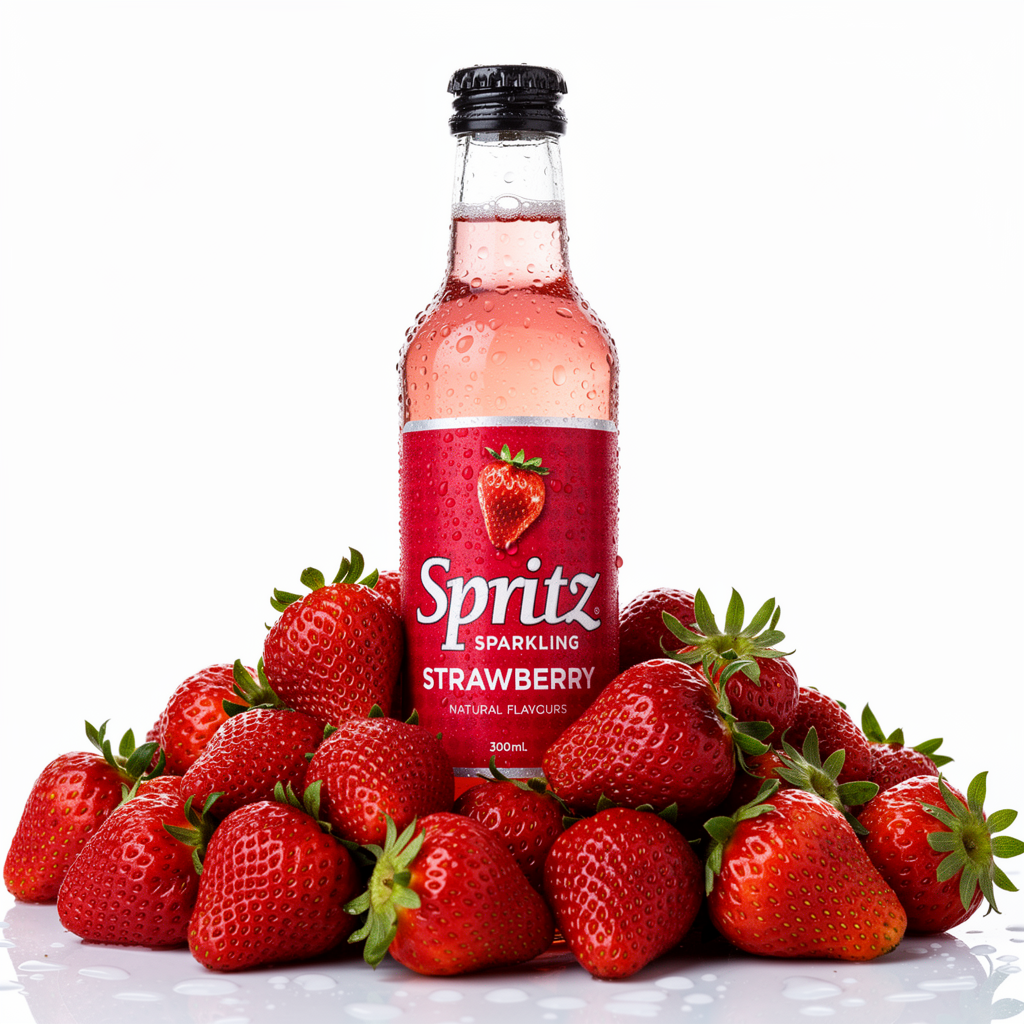 a professional high end product shot of this bottle in a pile of fresh wet strawberries on white background, studio lighting