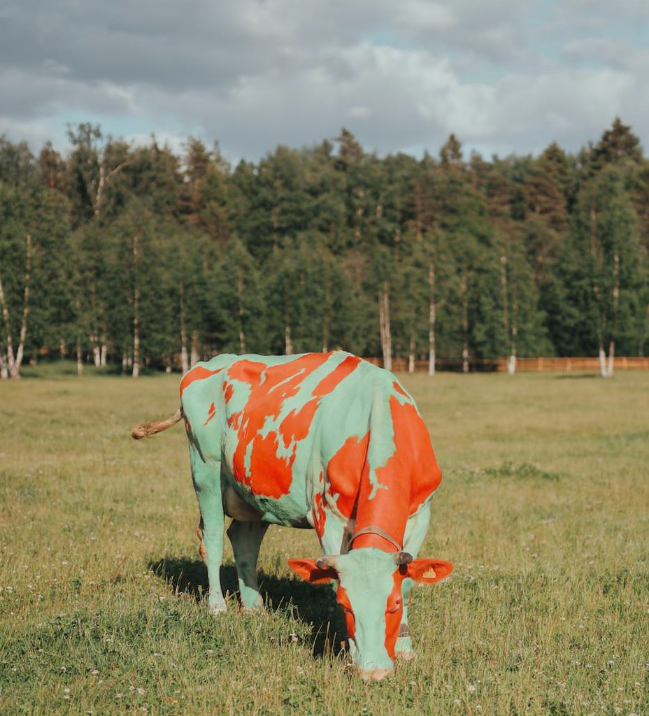 Change the cow's white fur to the color #8bc4bb and its black spots to #de4528