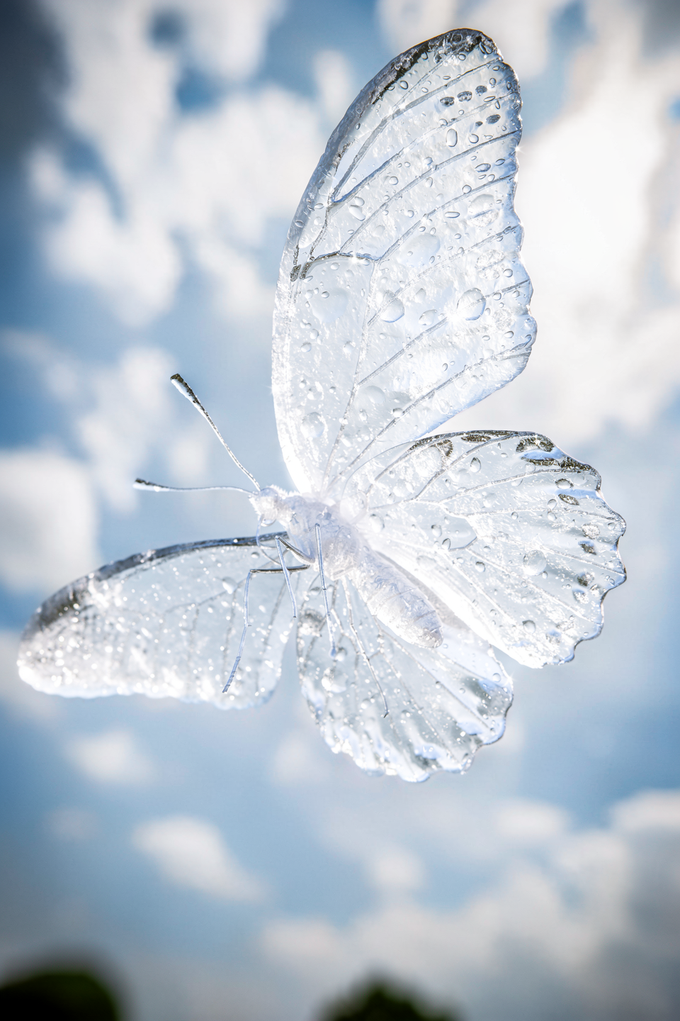 Turn the butterfly into one sculpted from clear ice, with tiny droplets forming across its frozen surface. Create a refined, realistic texture, preserving the original style of the image