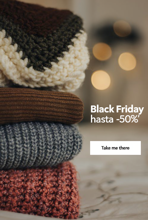 Use this image to create an ad. Add the text 'Black Friday hasta -50%' on the right side, making sure it does not overlay the clothes. Add a call-to-action button that says 'Take me there'