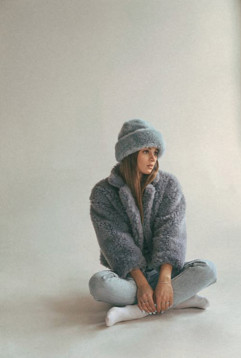 Add a short fluffy jacket on her colored #778899, and a hat in the same fluffy style, colored #98AFC7. Keep her pose