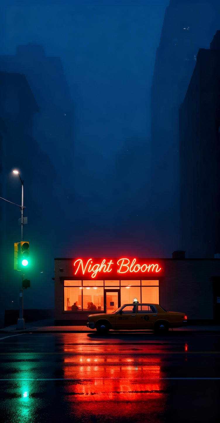 Replace the shop sign with a red-orange neon sign that says 'Night Bloom', and add a green traffic light on the left side of the frame.