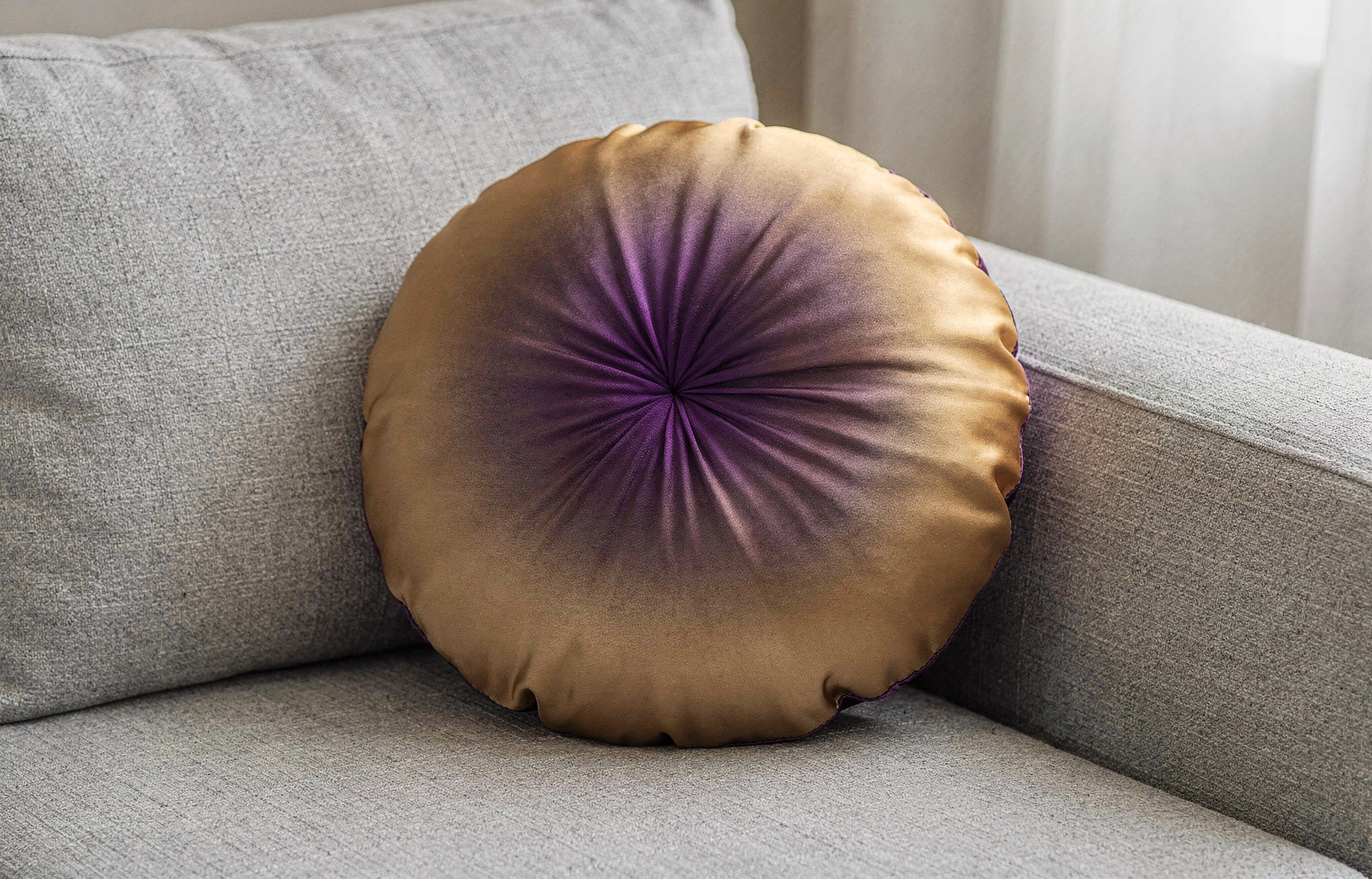 A round silk throw pillow resting on a light gray linen sofa, the fabric of the pillow shows a radial gradient from rich purple (#6A0DAD) at the center fading outward to warm gold (#FFD700) at the edges, even ambient indoor lighting, close-up perspective.