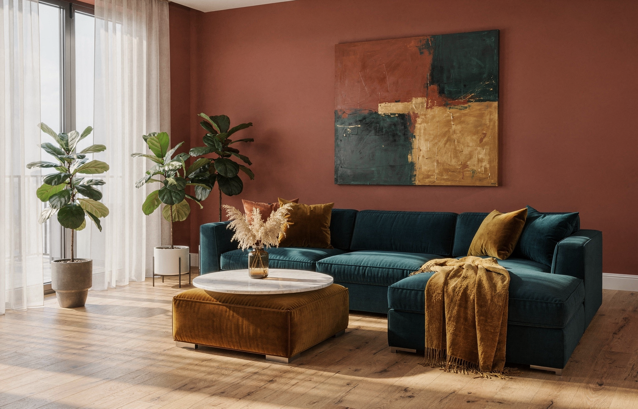 A modern living room with warm terracotta walls in hex #C4725A, a large L-shaped sectional sofa in deep teal hex #1B6B6F, and golden amber hex #E8A847 accent pillows, throw blanket, and a velvet ottoman. Light oak hardwood floors, a round marble coffee table with dried pampas grass in a glass vase, floor-to-ceiling windows with sheer white curtains letting in soft afternoon light, two potted fiddle leaf figs, and an abstract painting on the main wall featuring all three accent colors. Clean minimal composition, natural daylight casting soft shadows across the room.