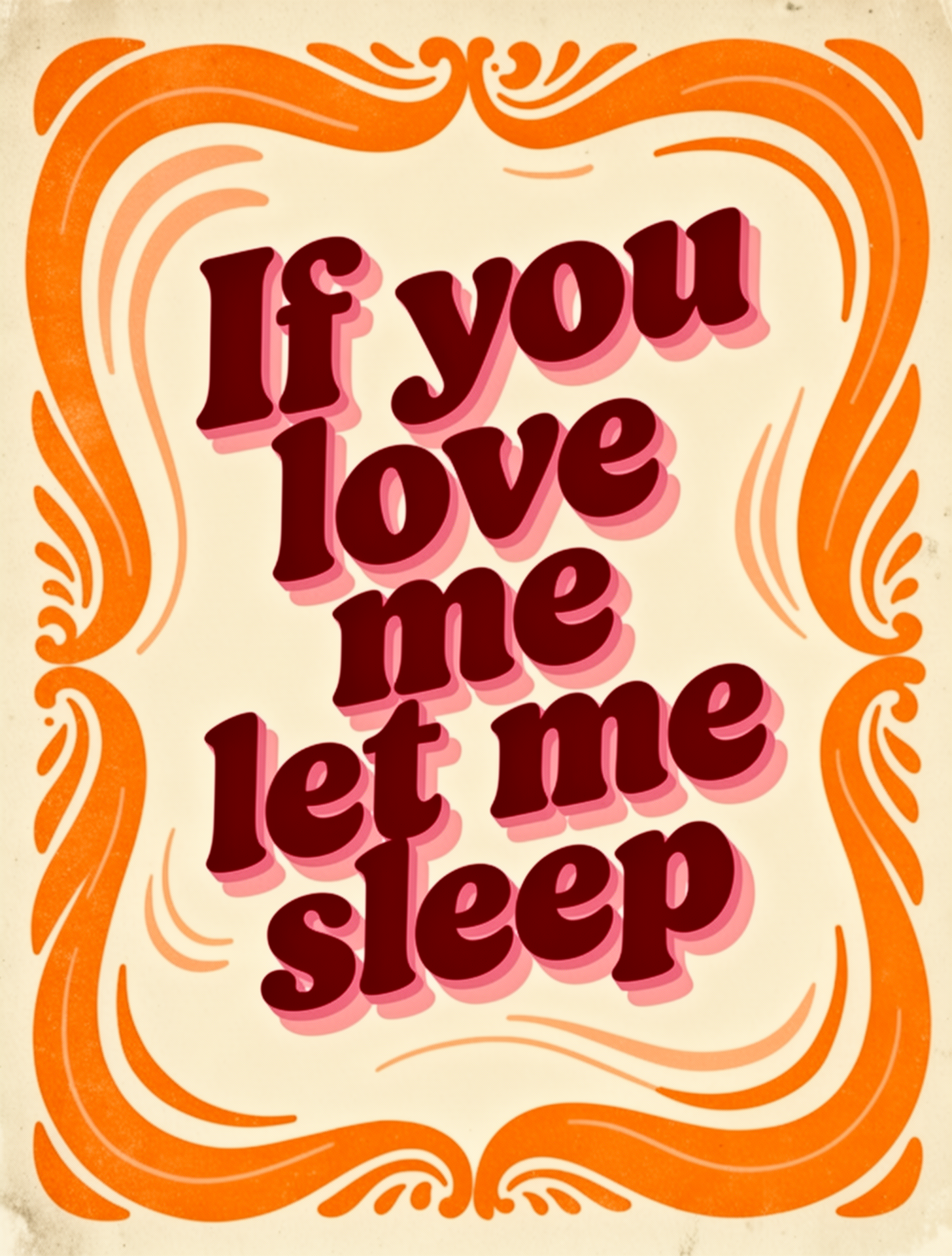 Groovy retro poster with the quote "If you love me let me sleep". Bold 70s typography in deep red and warm pink tones. Cream background and bold orange doodle around the text. Funky layout with playful shadow. Style: bold vintage aesthetic, dopamine decor
