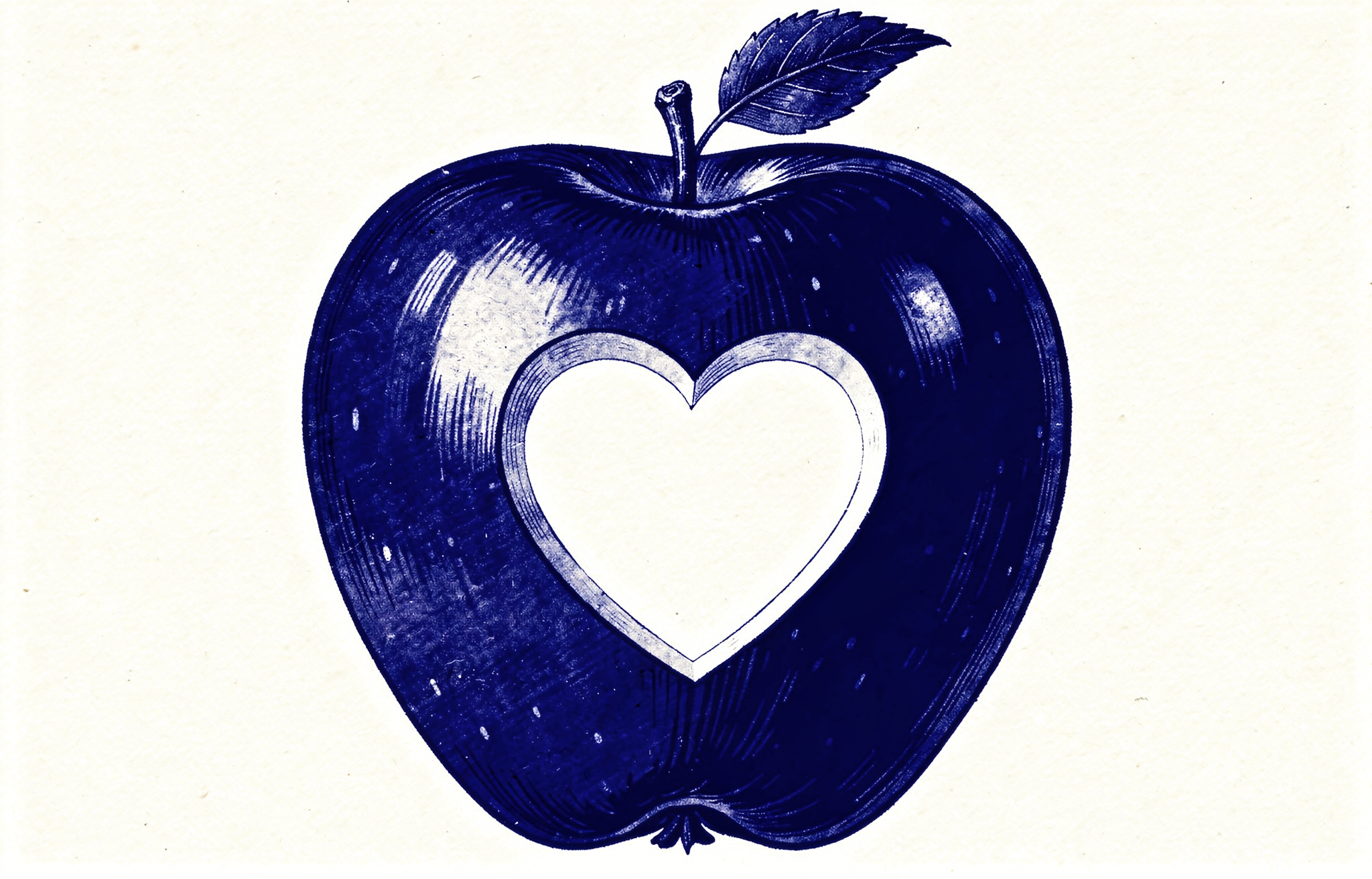 a vintage illustration of an apple in color #0047AB with a heart-shaped cutout in the middle, on a white background