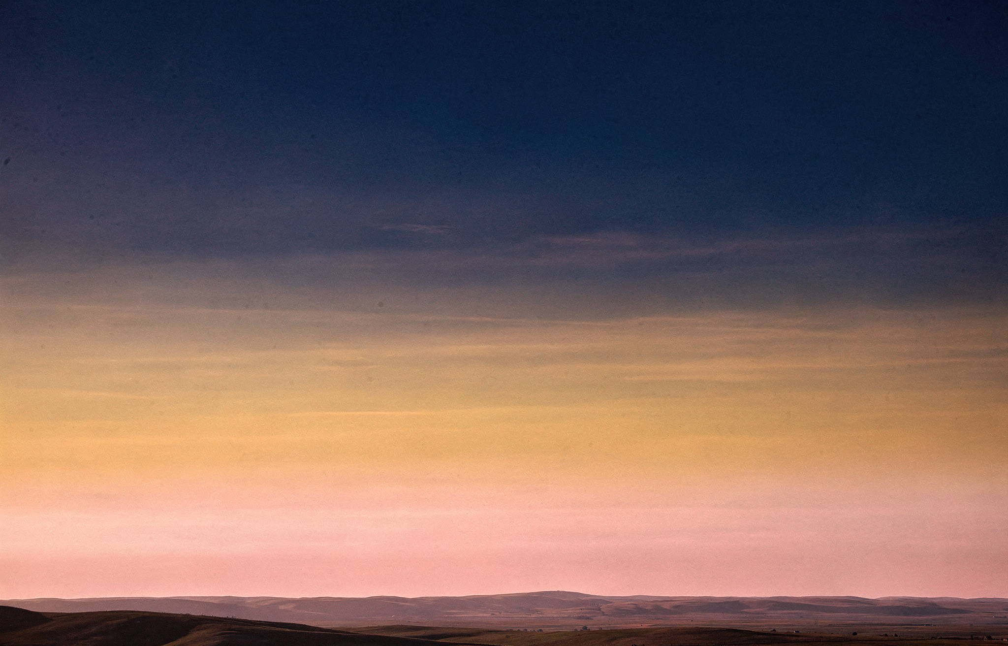 A wide panoramic view of a vast open sky stretching above a flat horizon line hills. The sky fills the entire frame and displays three distinct horizontal color zones blending smoothly into each other. The upper portion of the sky is deep indigo (#1B0A3E), gradually transitioning through the middle into a warm burnt amber (#CF6A2E), and the lowest section near the horizon glows in soft rose pink (#E8728A).