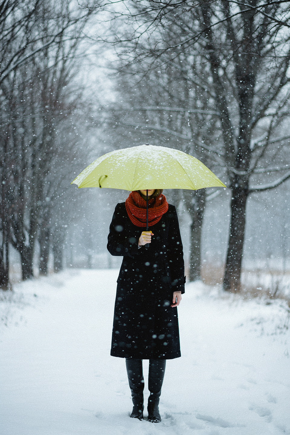 Keep the woman's pose unchanged. It is now heavily snowing, the background is white and the trees are bare. Snowflakes are visible falling in the frame. The woman is wearing a black coat, and the umbrella is a yellowish-green color