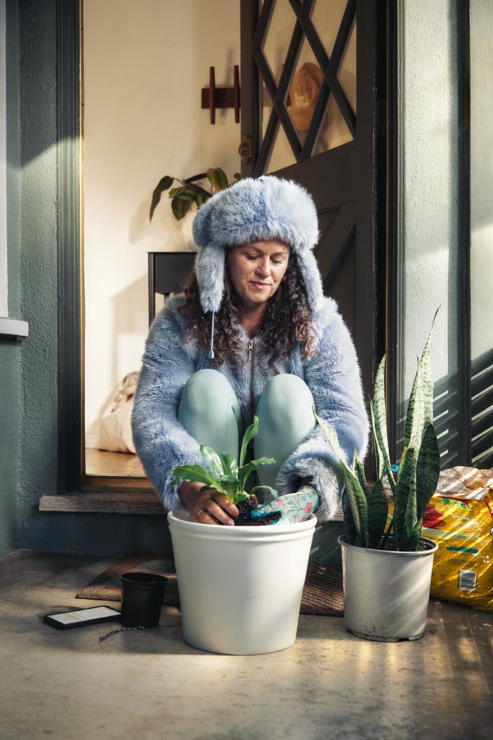 Add a short fluffy jacket on her colored #778899, and a hat in the same fluffy style, colored #98AFC7. Keep her pose