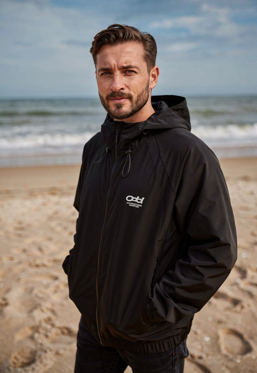The man is wearing the hooded jacket from image 1, walking on a beach at golden hour