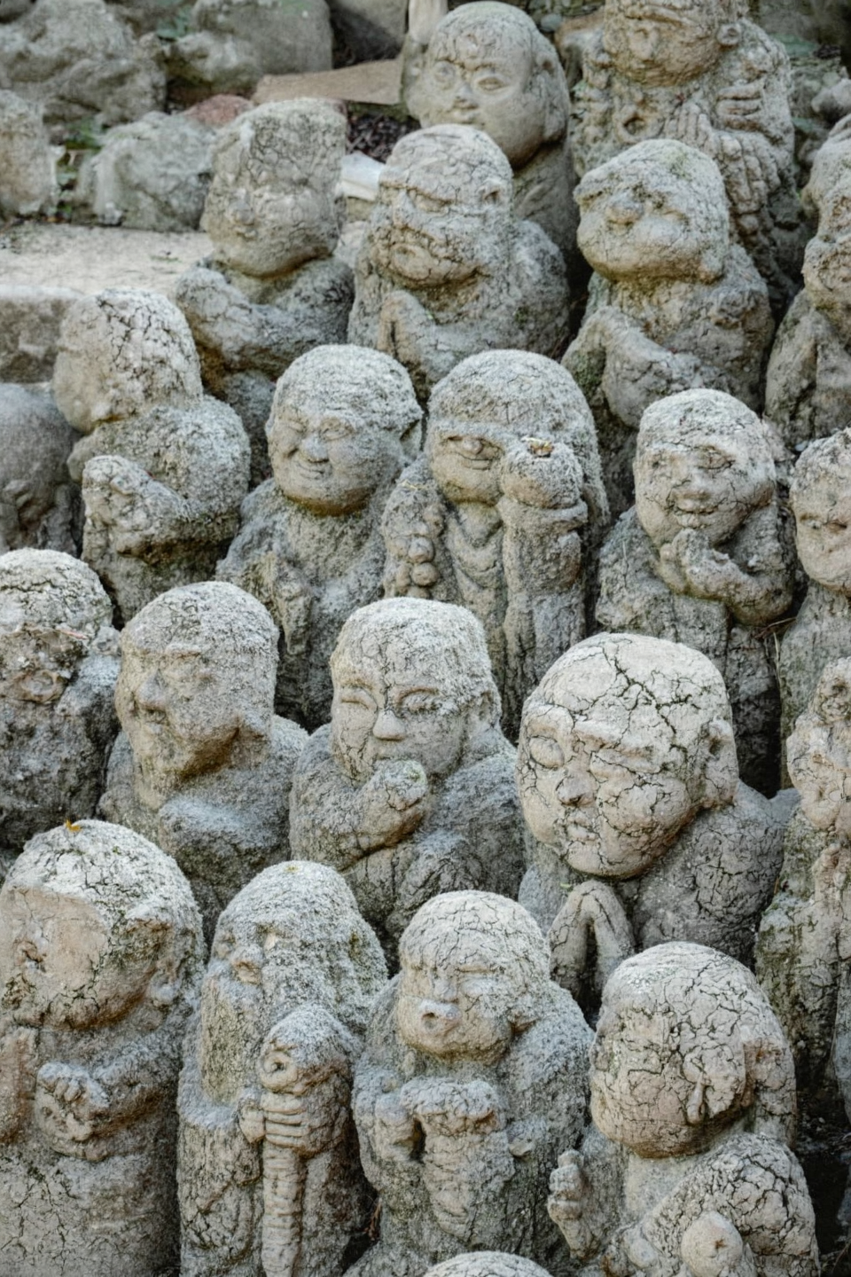 Remove all vegetation moss and greenery from the statues. Keep only the original stone structure with no plants no moss no algae no green tint. Reveal the raw stone texture with visible small cracks and natural erosion.