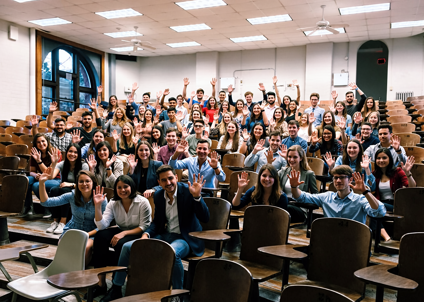 Add many students sitting on the chairs, all waving and looking toward the camera.