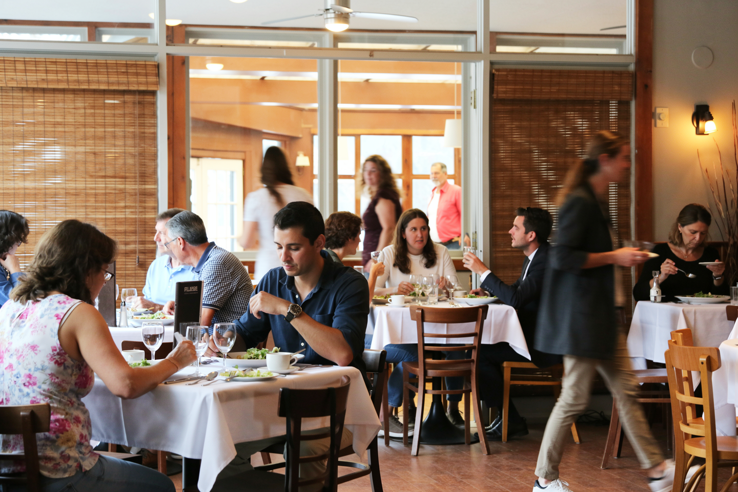 Add visitors to the restaurant in the image. Some should be sitting and eating, and some walking with slight motion blur, to make the place feel full and lively
