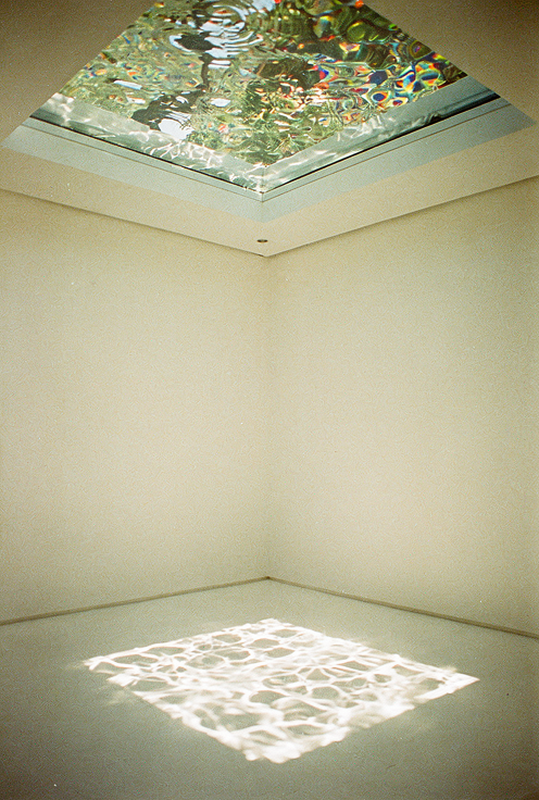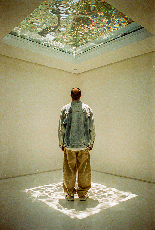 Add to the space beneath the glass ceiling a man wearing wide khaki jeans and an oversized denim jacket, standing with his back to the camera and looking upward.