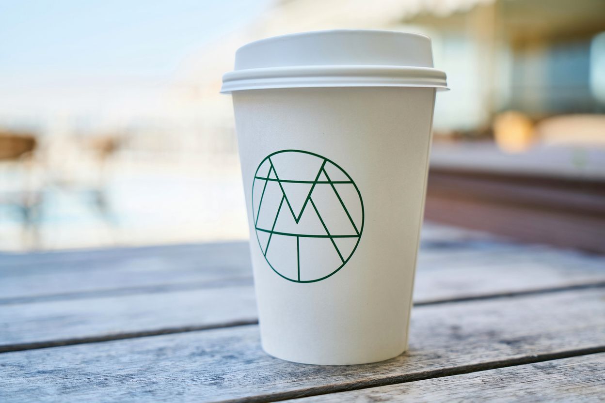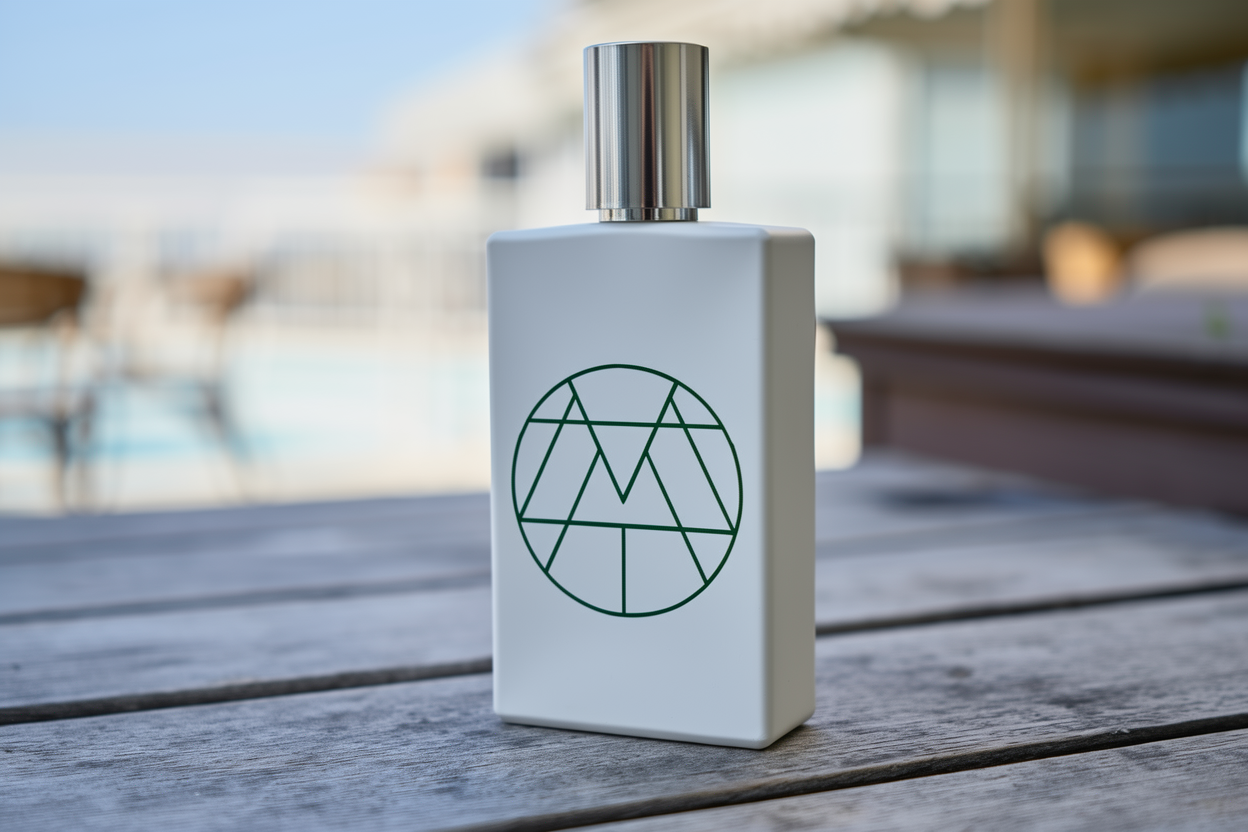 Use this logo on a perfume bottle designed in the shape of a takeaway coffee cup. Make the logo appear naturally printed on the bottle, with realistic lighting, reflections, and product-style presentation.