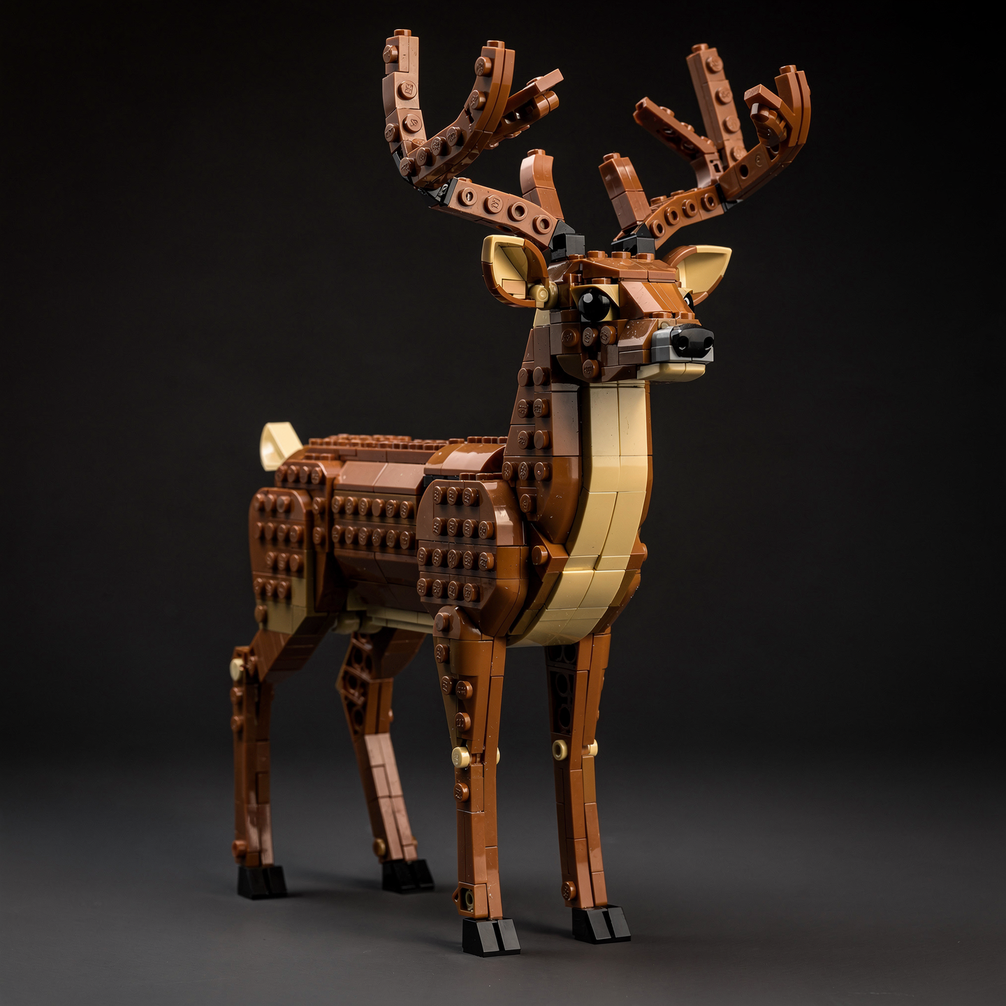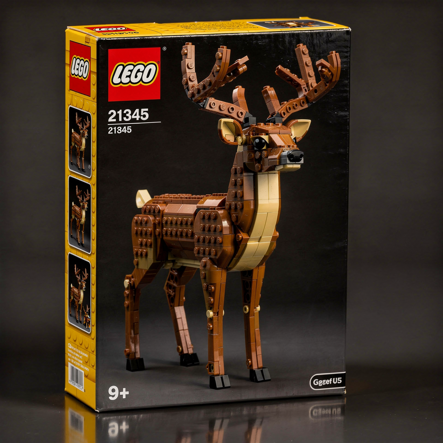 Place the LEGO deer product image on a real LEGO retail box designed for sale. The box should be a glossy printed cardboard package with sharp edges, folded seams, and a slightly reflective coated surface. Show the official LEGO logo printed clearly in the top corner.
