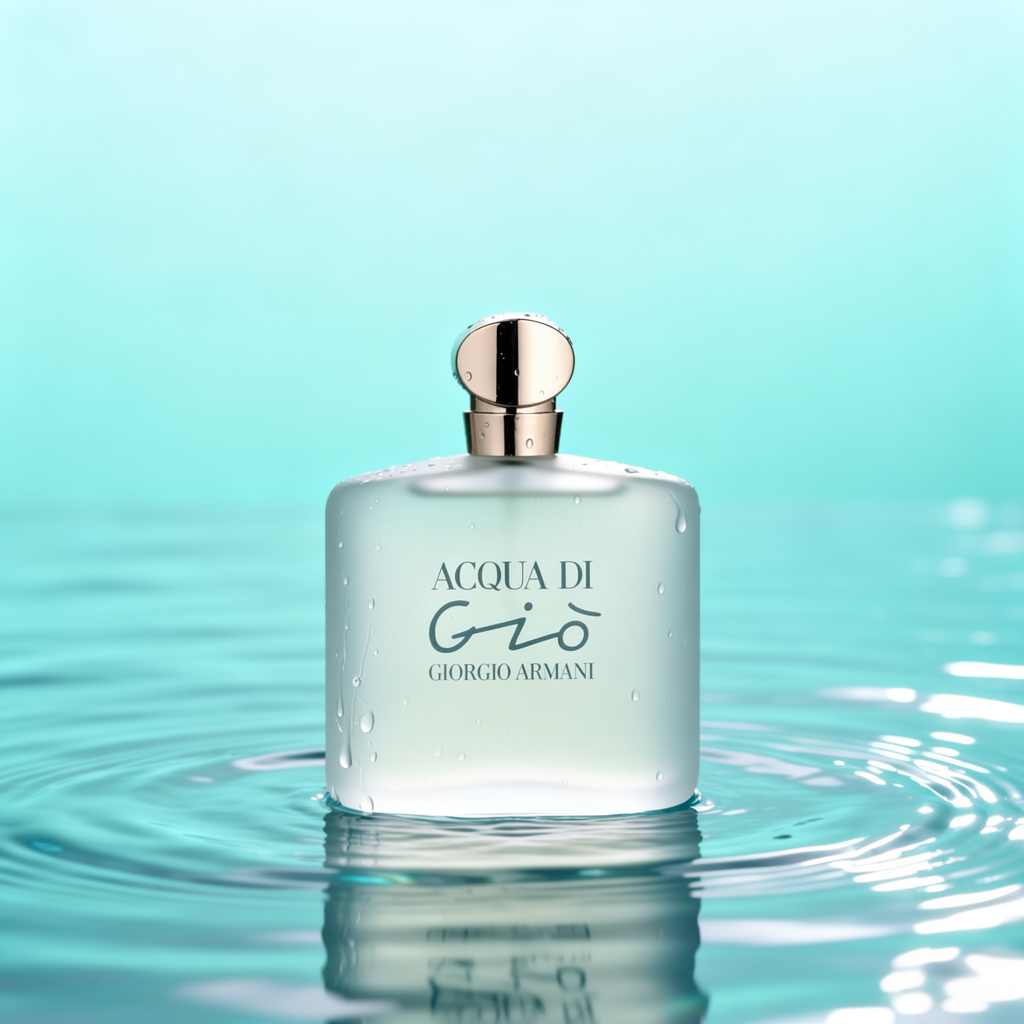 A high-quality sharp photograph featuring this wet perfume bottle centered in the composition, surrounded by a serene aquatic setting. The background is a soft gradient of light turquoise and aqua. The bottle is partially submerged, creating gentle ripples and reflections in the water.