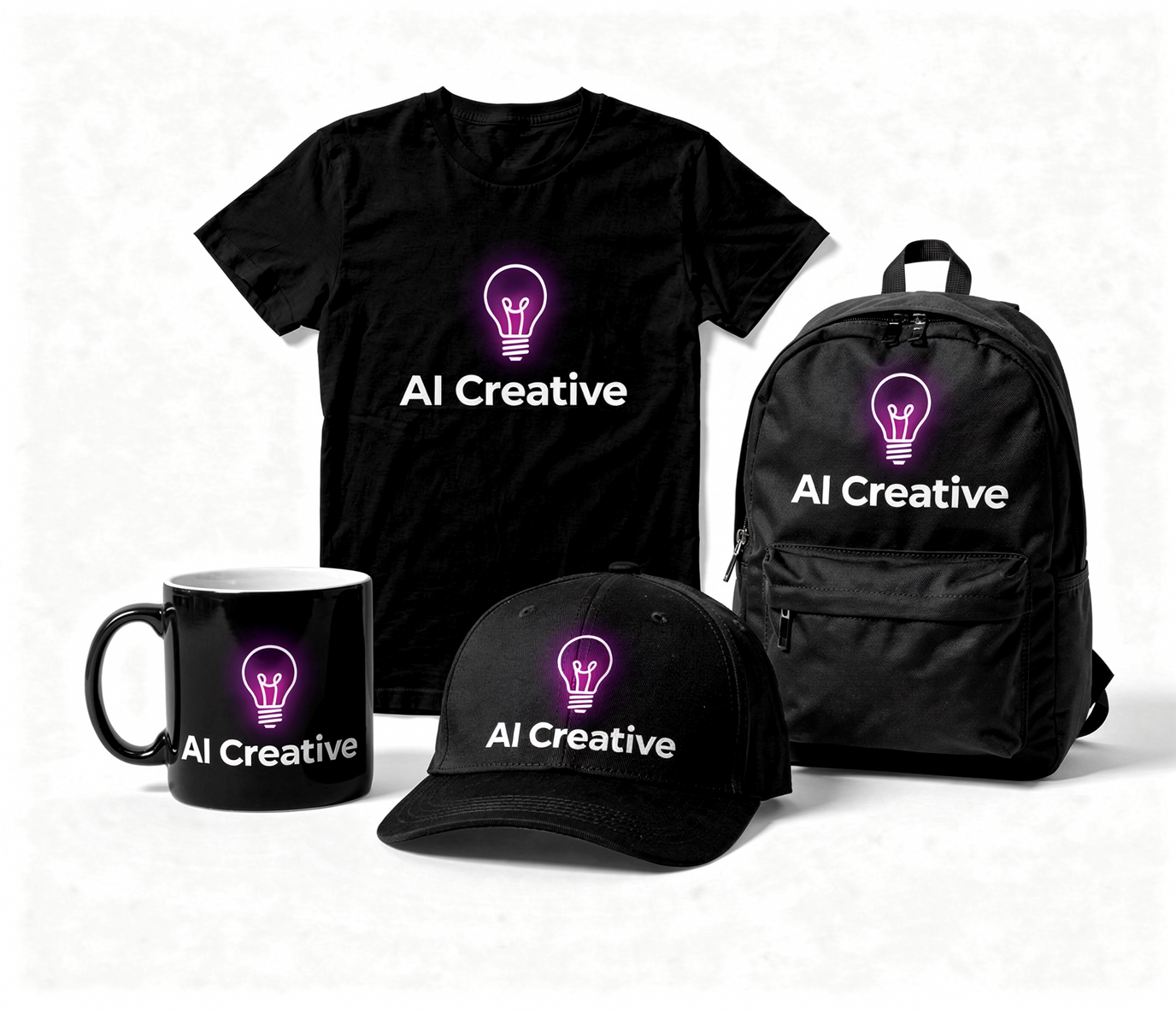 Create merchandise with this logo: black mug, black t-shirt, black cap and a black backpack. On white background